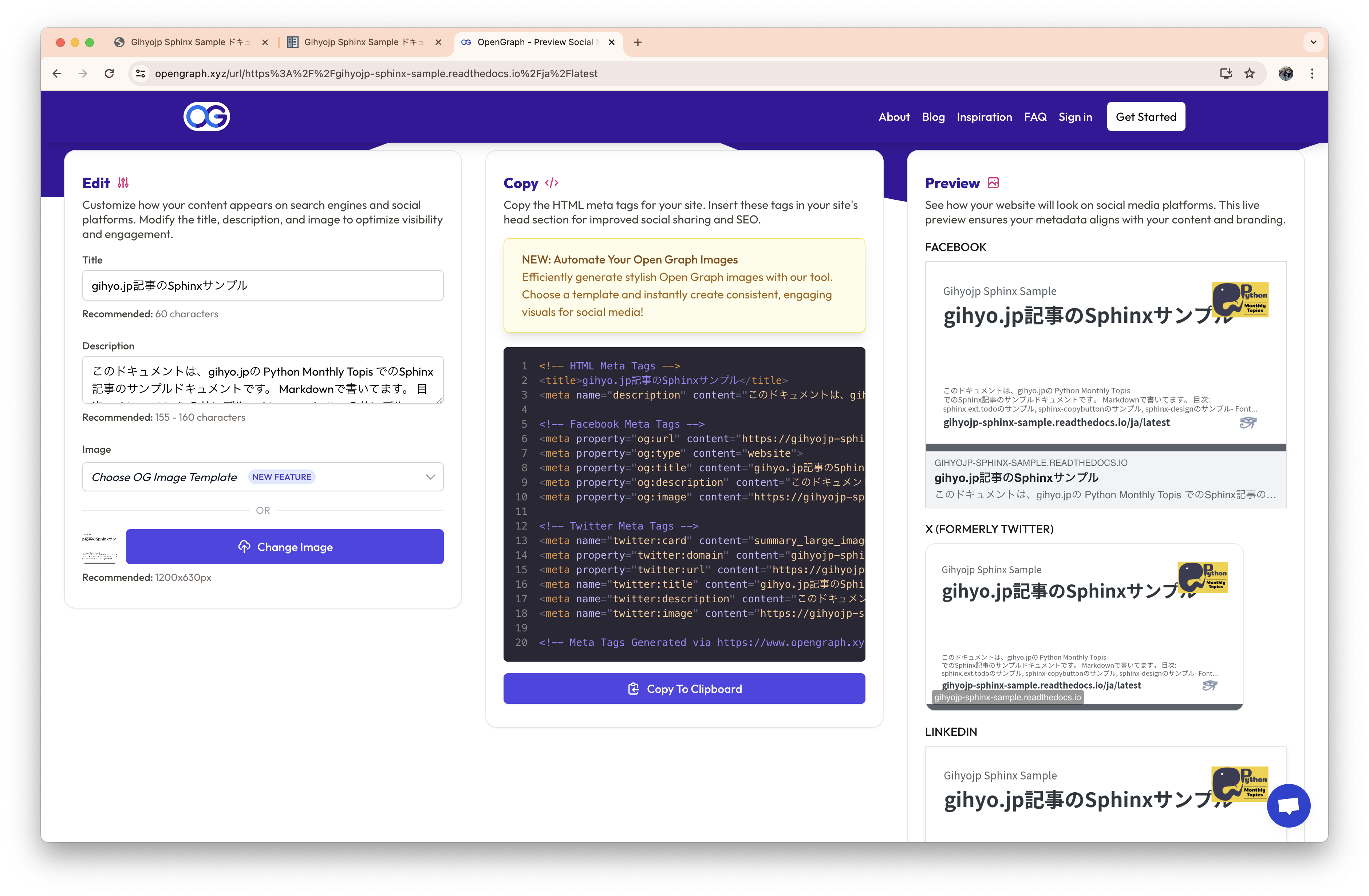 各SNSで実際にどのように表示されるかを、www.opengraph.xyzというサイトにURLを入力して確認します。 すると、以下の様にソーシャルカードが生成され、プレビューがわかりやすくなったことがわかります。