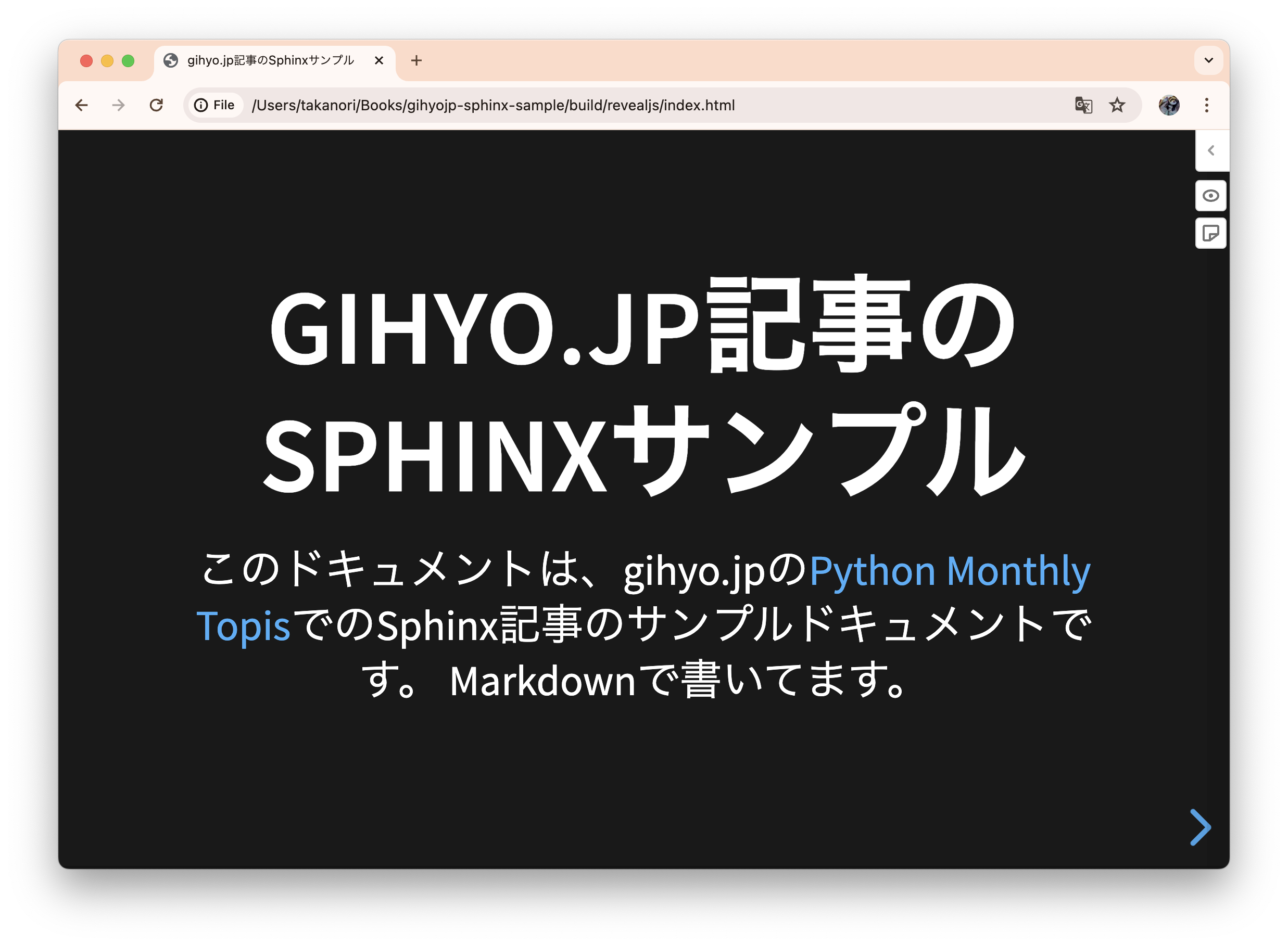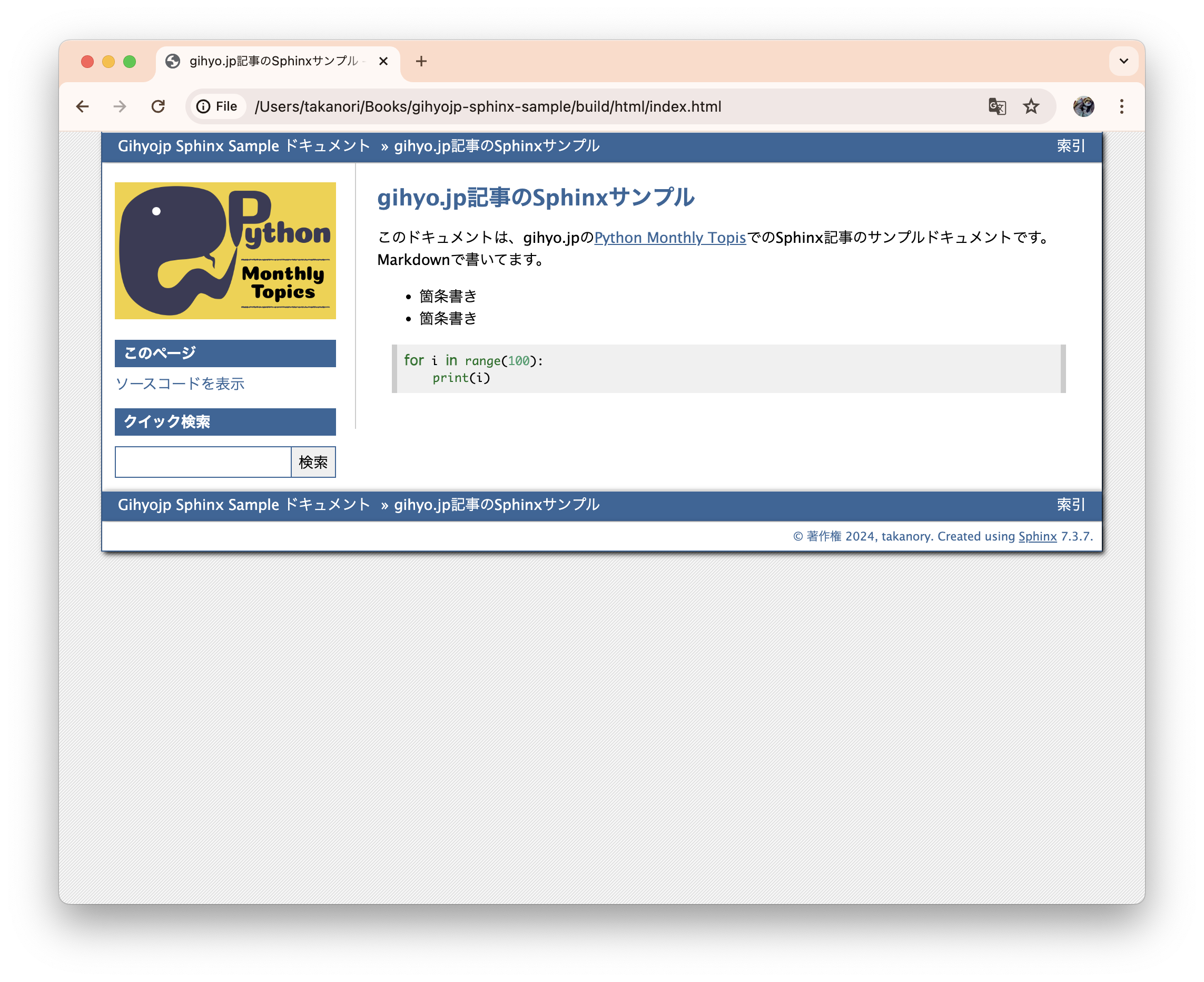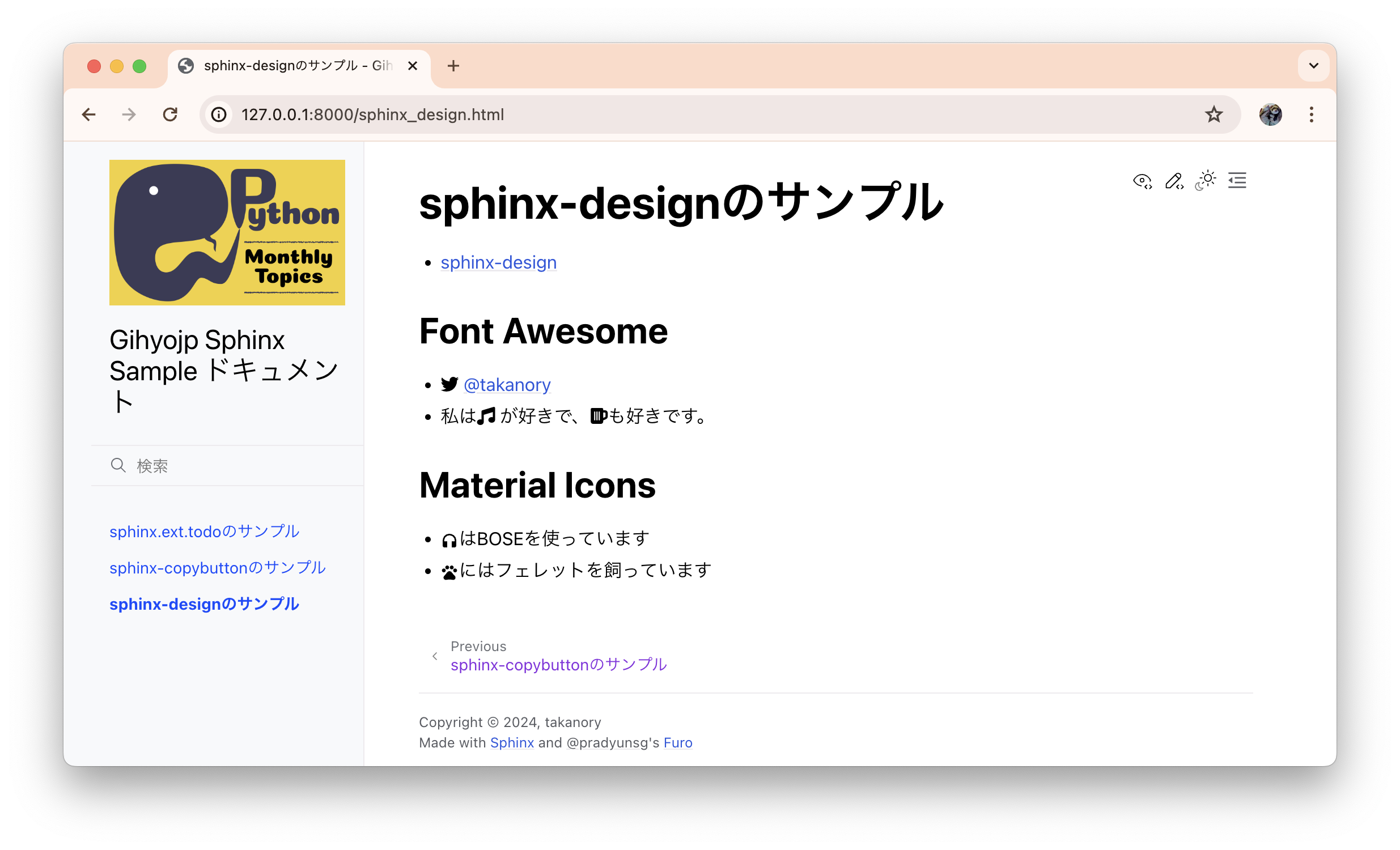 <meta name="description" content="このドキュメントは、gihyo.jpの Python Monthly Topis でのSphinx記事のサンプルドキュメントです。 Markdownで書いてます。 目次: sphinx.ext.todoのサンプル, sphinx-copybuttonのサンプル, sphinx-designのサンプル- Font Awesome, Material Icons.. TODOリスト:( 元のエン..." />