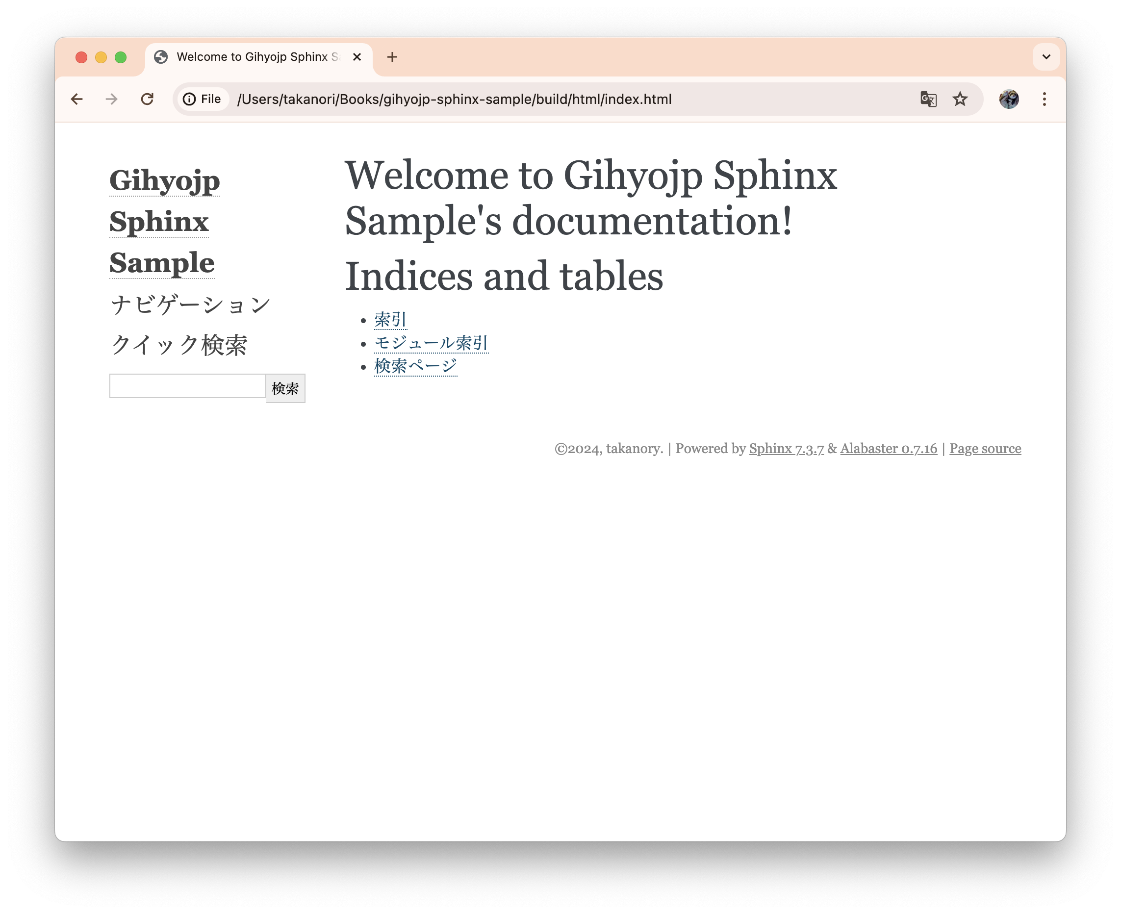 ここでmake htmlコマンドを実行するとHTMLファイルがbuild/html/フォルダー以下に生成されます。 index.htmlファイルをWebブラウザで開くと、結果が確認できます。