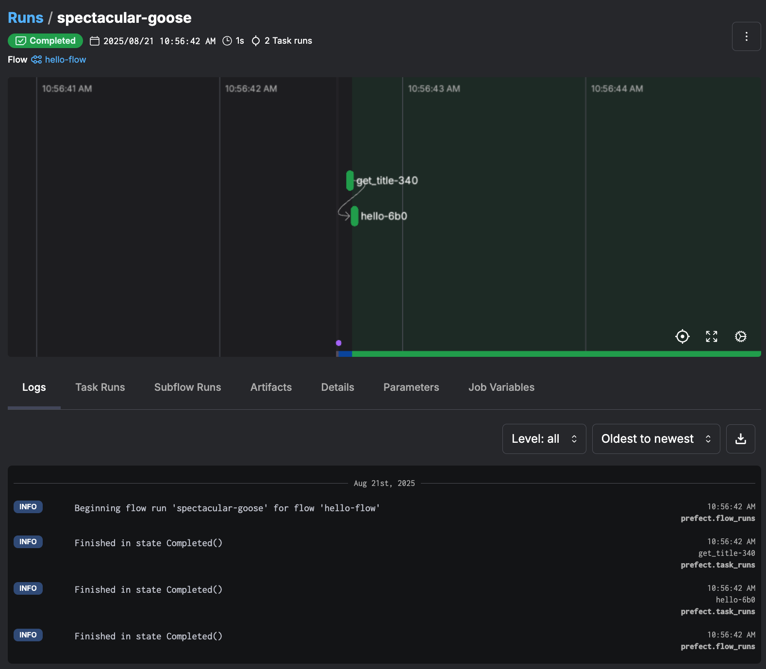 Work Pools がReady状態になったことで、ようやくフローを実行できる準備がすべて整いました。 試しにデプロイメント画面から「Run」ボタンで実行してみると、フローが実行されて完了したことを確認できます。 また、筆者の環境ではスケジュールされた時間でも自動的にタスクが実行されることを確認できました。