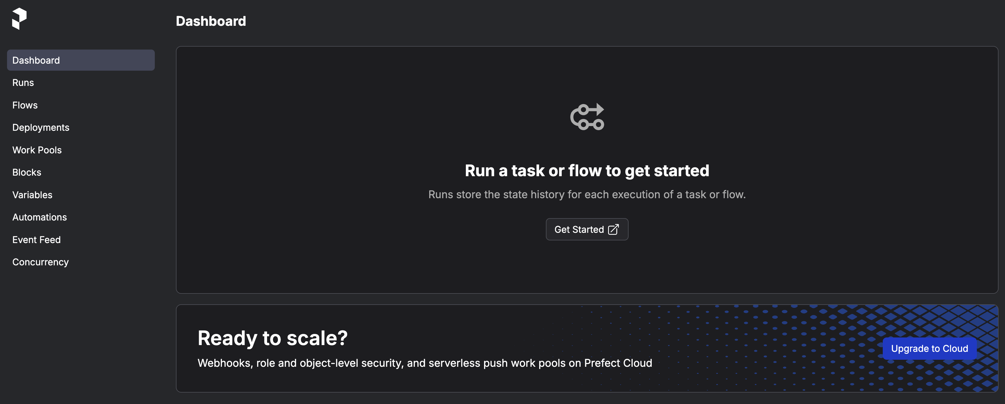 実際にアクセスしてみると以下のような画面が表示されます。 (初回アクセス時には「Join the Prefect Community」としてSlackへの登録画面が表示されることがあります。 「Skip」で登録を省略できますが、興味のある方は登録してコミュニティに参加してみてください)