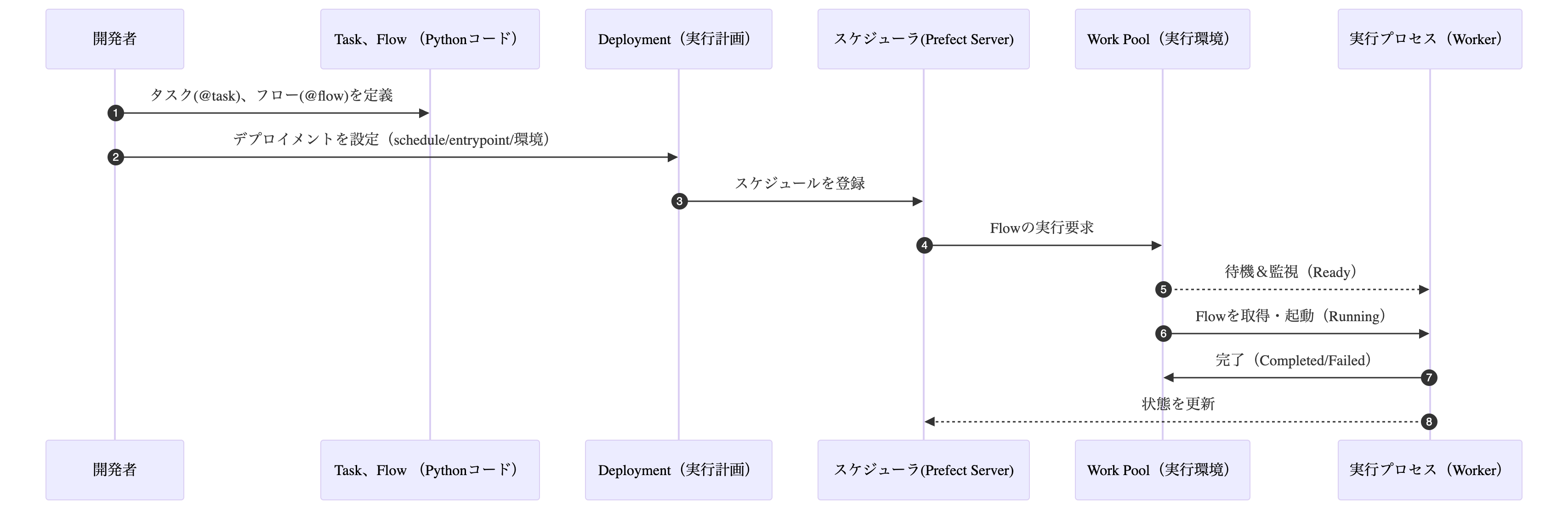 ここで改めて、全体の流れを確認してみましょう。 Prefect の実行は以下のような流れで進みます。
