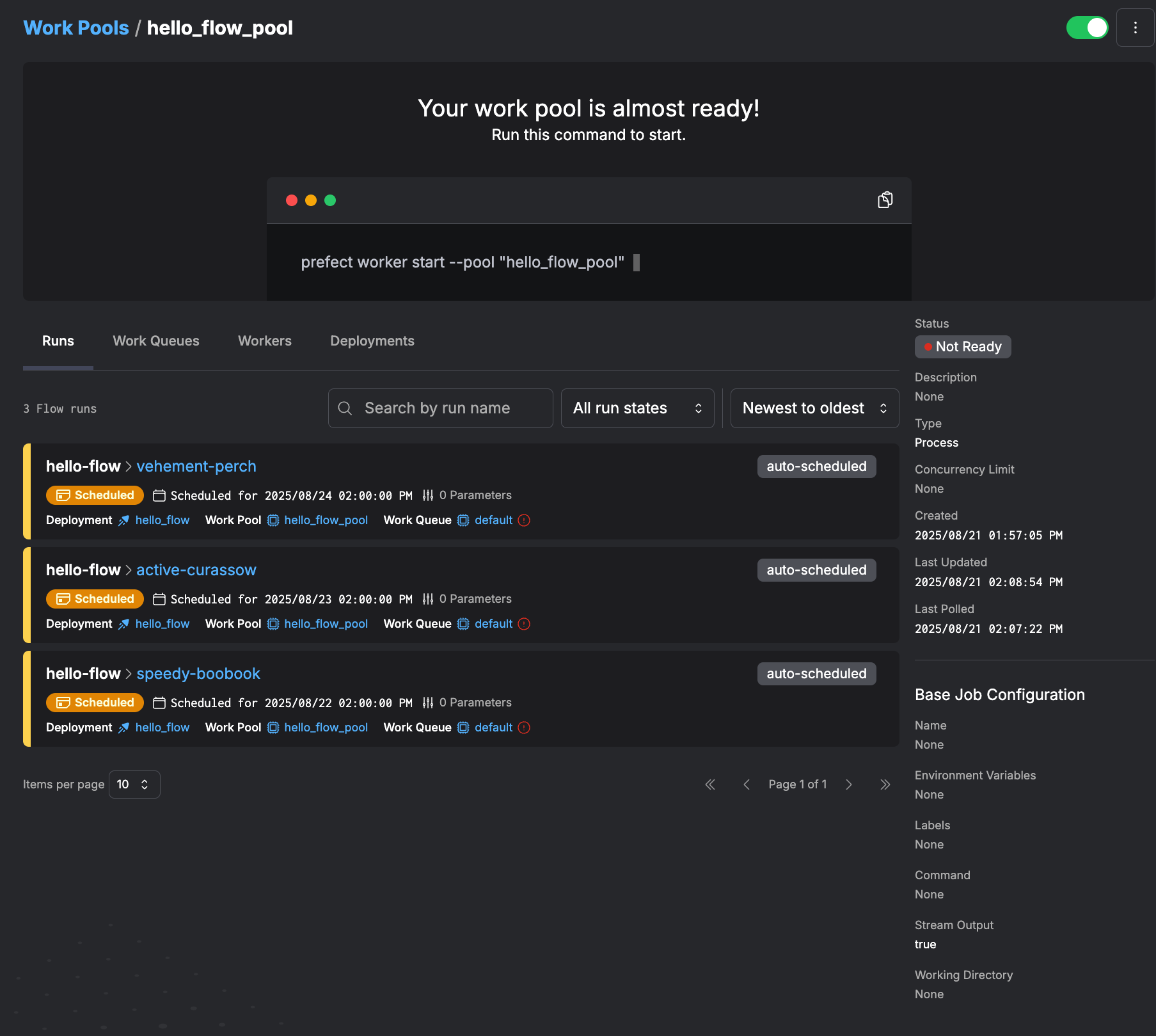 実行環境であるWork Poolを起動するには、Web UI上に表示されている prefect worker start --pool "hello_flow_pool" を実行する必要があります。